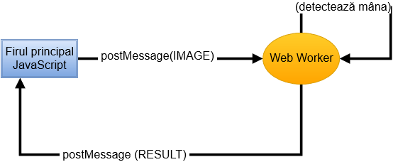 Web Worker, o modalitate de a rula cod Javascript independent de firul principal de execuție. Trimiterea imaginii și comunicarea rezultatelor se face printr-un sistem asincron de mesaje.